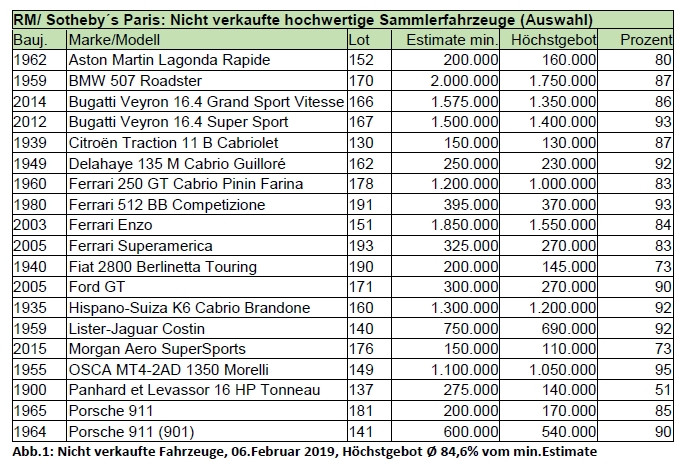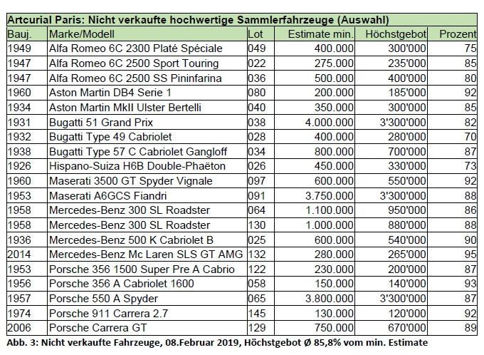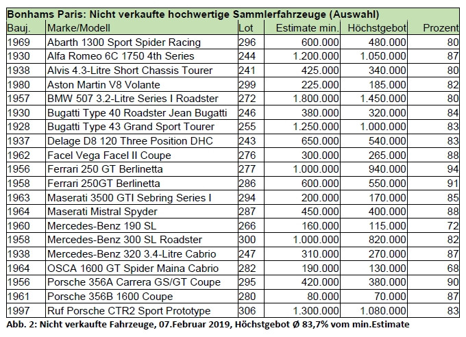 Das Bieterverhalten, das sich Anfang des Jahres 2019 in den Januar Auktionen am US-Markt bei Gooding & Co., Bonhams und RM/ Sotheby´s deutlich gezeigt hat, ist auch in Paris und damit in Europa angekommen. Fahrzeuge, um die sich bislang die Bieter mit immer neuen Höchstgeboten stritten, bleiben stehen da die Gebote bei durchschnittlich rund 85% der Aufrufpreise beendet und die Marktpreise gedeckelt wurden. In allen drei Auktionen, die vom 06. bis 08. Februar 2019 in Paris stattfanden, beendeten die Bieter teilweise kurz vor Erreichen des Zuschlagspreises ihre Gebote und die Fahrzeug wurden aus dem Angebot genommen. Diese Tendenz war bei allen drei Auktionen identisch (siehe die Abb. 1 bis 3 der nichtverkauften hochwertigen Sammlerfahrzeuge).