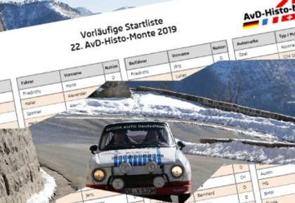 Durch Deutschland, die Schweiz, Frankreich, Italien und Monaco führt die AvD Histo-Monte in 2019. Über mehr als 1.800 Kilometer und auf den Spuren der ehemaligen Sternfahrt zur Rallye Monte Carlo müssen von den Teams in rund 80 Wertungsprüfungen absolviert werden. Das 25-jährige Jubiläum der AvD-Histo-Monte 2017 war ein voller Erfolg. Eine Rekordzahl von 82 Fahrzeugen begab sich am 8. Februar in der Klassikstadt Frankfurt auf den Weg nach Monte Carlo, unter ihnen auch Rallye-Weltmeister Walter Röhrl im Audi Quattro sowie Star-Kabarettist Urban Priol, Rallye-Fahrer Matthias Kahle und Motorrad-Ass Stefan Prein. Mit bis zu 2048 Meter hohen, schneebedeckten Pässen, unzähligen fahrerischen wie landschaftlichen Highlights ist die AvD-Histo-Monte nach einhelliger Meinung ein besonderes Hightlight unter den Events mit historischen Fahrzeugen. Mehr zur Rallye unter dem weiterführenden Link.